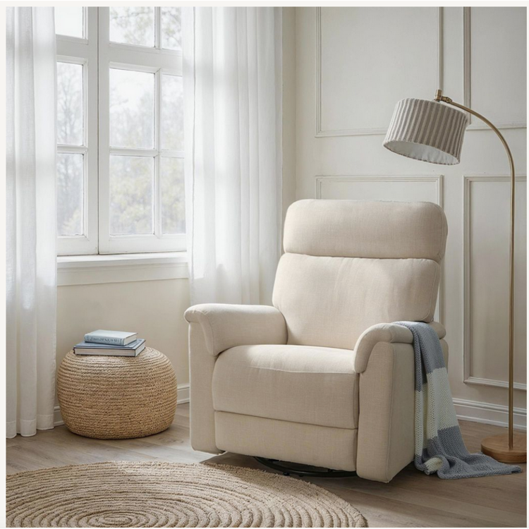 Picture this: It's 2 AM, and your little one needs you. With the Alden Power Swivel Glider Recliner, you're ready. The gentle under-chair night light guides you safely through the darkness while your baby stays peacefully asleep in your arms. Swivel effortlessly to reach for essentials or face the crib, then glide and recline at the touch of a button – headrest adjusted just right, chair positioned to cradle you both in comfort.