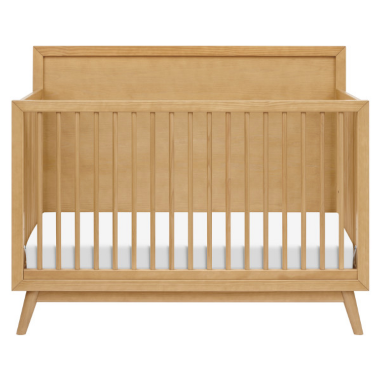 The Palma 4-in-1 Convertible Crib, with its high headboard and clean mitered joinery is the ultimate centerpiece to a stylish mid-century nursery. The crib’s wood-stained base and contrast satin finish highlight modern elements such as tapered, flared legs borrowed from iconic ‘50s and ‘60s furniture silhouettes. Made with eco-friendly, non-toxic materials, the Palma converts to a toddler bed, daybed (toddler bed conversion kit included) and later a full-size bed for easy transition from infant to teen years.