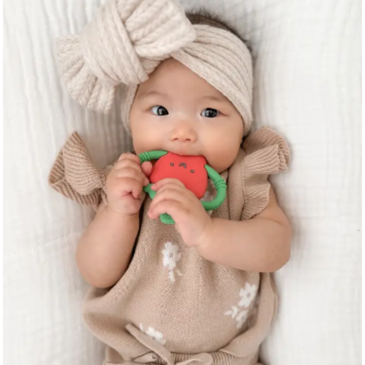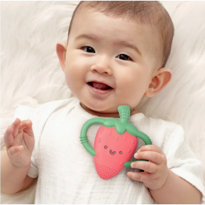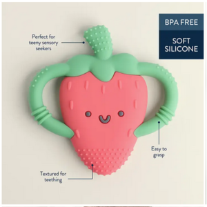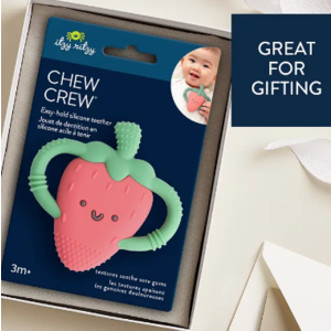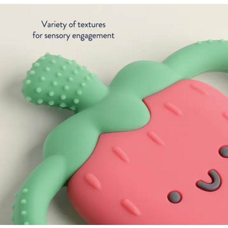 Bonnie the Strawberry! Chew on This! Easy-hold silicone teether 3m+ textures soothe sore gums Bonnie the Strawberry! Bid farewell to teething troubles with Itzy Ritzy’s Chew Crew™. Crafted with easy-to-hold handles, this teething companion offers soothing relief with a comfy grip for your baby`s teething journey.