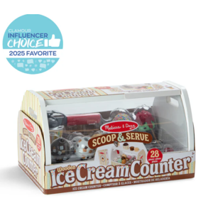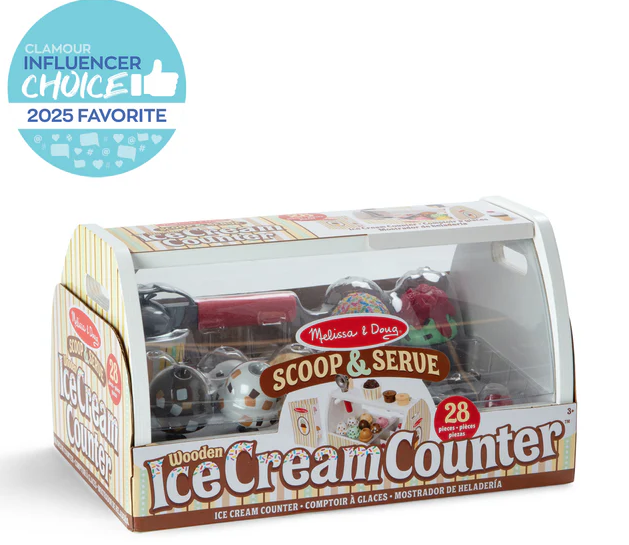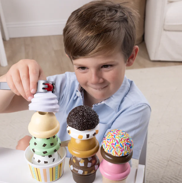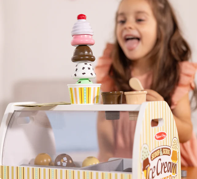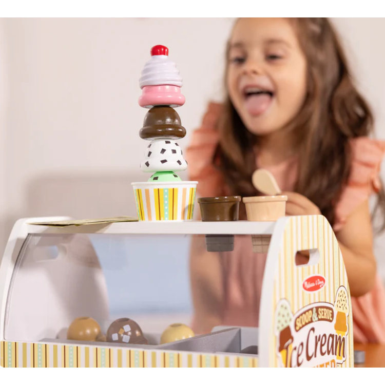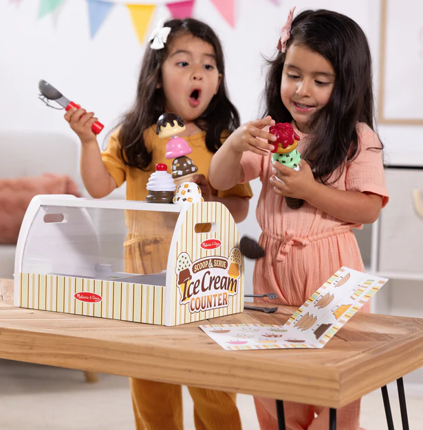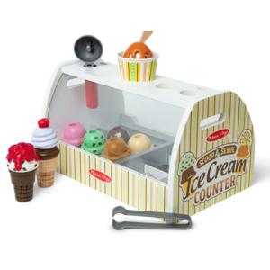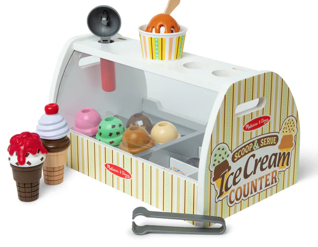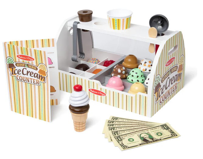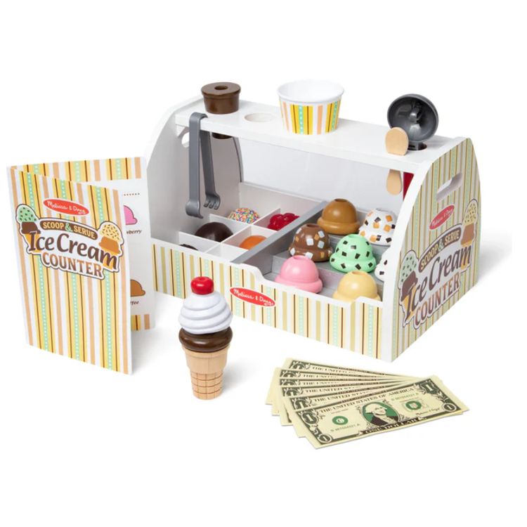 - Kids can scoop up some cool treats with this all-inclusive, 28-piece pretend play ice cream counter! The sturdy wooden tabletop counter holds eight wooden scoops of different-flavored ice cream, six assorted toppings, two cones, a plastic cup, an ice cream scooper, a wooden spoon, tongs, reusable menu card, and six pretend dollar bills to get started on your very own ice cream shop! The scooper fits into a hole on top of the scoops so little ones can easily lift, stack, and release. Take orders on the reusable menu card and serve up delicious fun with this ice cream play set by Melissa & Doug!