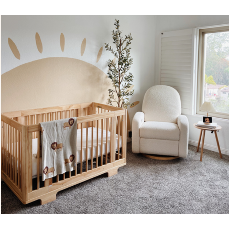 The Nami Glider Recliner is an elevated nursery accent piece that’s both playful and comfortable with its round and friendly silhouette. The oversized, organic proportions, coupled with its natural wood base, fit into a soft and modern palette.