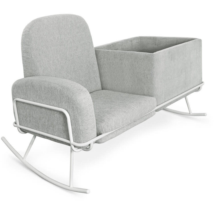 Interplay between soft, rounded wool cushions and molded powder-coated tubular steel framing balance each other, creating a streamlined finish. Ergonomic arm height supports comfortable feeding to the gentle rocking cadence of the rocker. An easy drop and tie conversion process transforms the Ami to a double seat rocker.