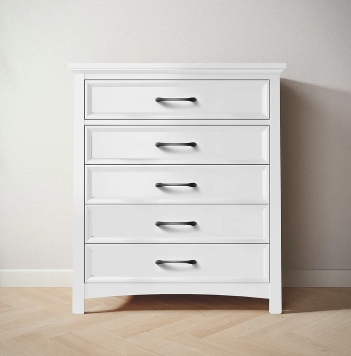 Serena Tall Chest has an abundance of storage. This unit takes a minimum amount of floor space and offers a maximum amount of drawer storage. Tall and handsome and featuring five deep drawers equipped with hydraulic soft-closing systems. The Serena Chest is the ideal baby furniture solution for safe and healthy nurseries, that will also stay with your child into their teen years.