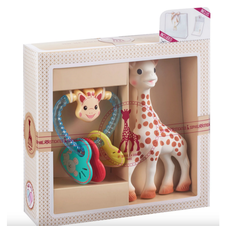 All “Sophisticated” sets include: a Sophie la Girafe + a heart rattle + a bag + a gift card