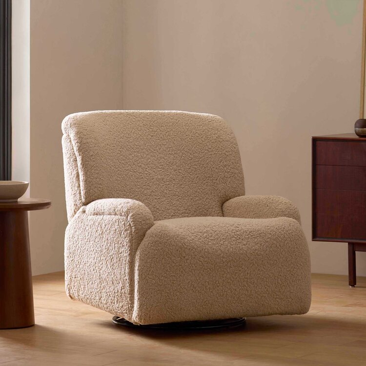 Comfortable and welcoming, the Winslow Collection is upholstered in high pile shearling fabric for a luxuriously soft seating experience. The chair's extra wide seat and high wing back is complemented by gracefully rolled arms, while its swivel function and hidden recline mechanism provide modern adaptability. Available in various neutral tones, Winslow's cozy nature will soon become your favorite seat in the house.